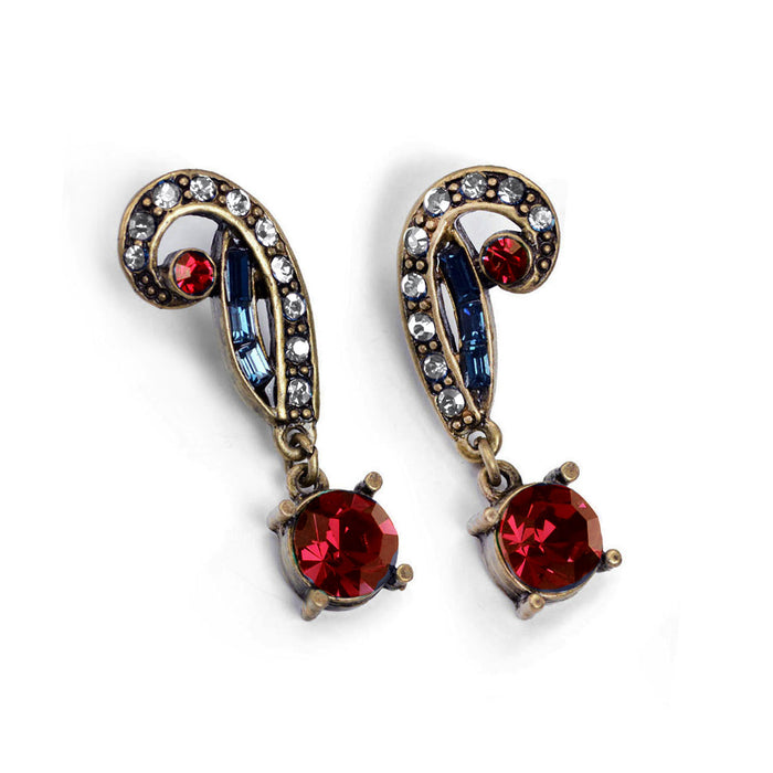 The design of these art deco earrings is pure vintage Hollywood. Premium crystal baguette and round cut stones arch into a graceful curlicue with a luscious single stone drop. In the 1920s and 30s, geometric lines and curves defined everything from fashion to building designs. Art deco style is feminine and sophisticated. Old Hollywood glamour has never lapsed because the art deco style continues to be regarded and admired as modernist. Movies such as Gatsby, Cafe Society and the TV series Downton Abbey are loved for their period costuming as much as for their storylines. These earrings are offered in your choice of crystal on burnished silver or deep sapphire blue on burnished bronze. Made in our Los Angeles studios and signed Sweet Romance USA.