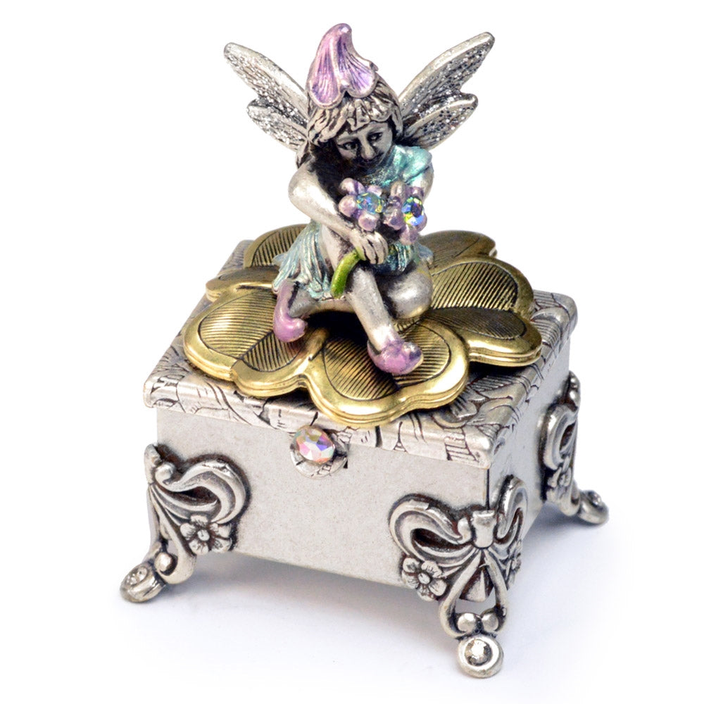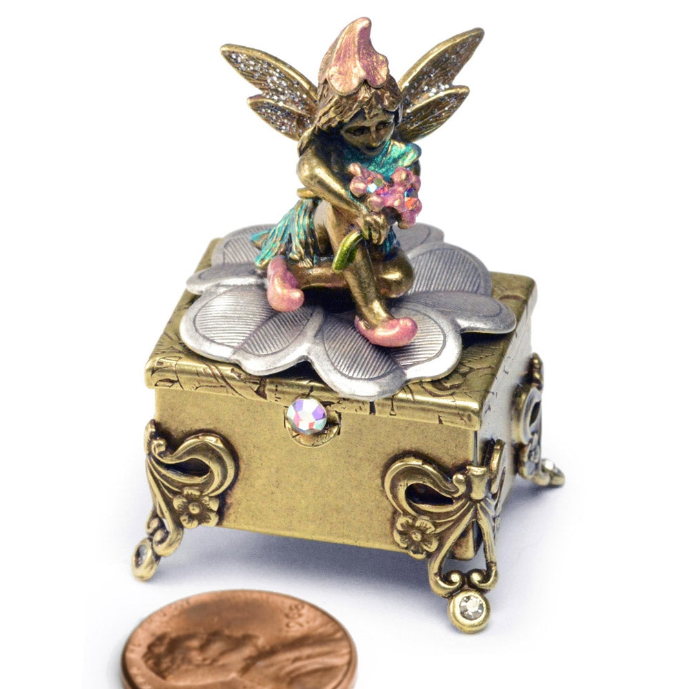 Let her be your child's tooth fairy or add to a collection. Choice of bronze or silver, she is a detailed and dimensional sculpture seated on a footed hinged box.