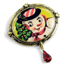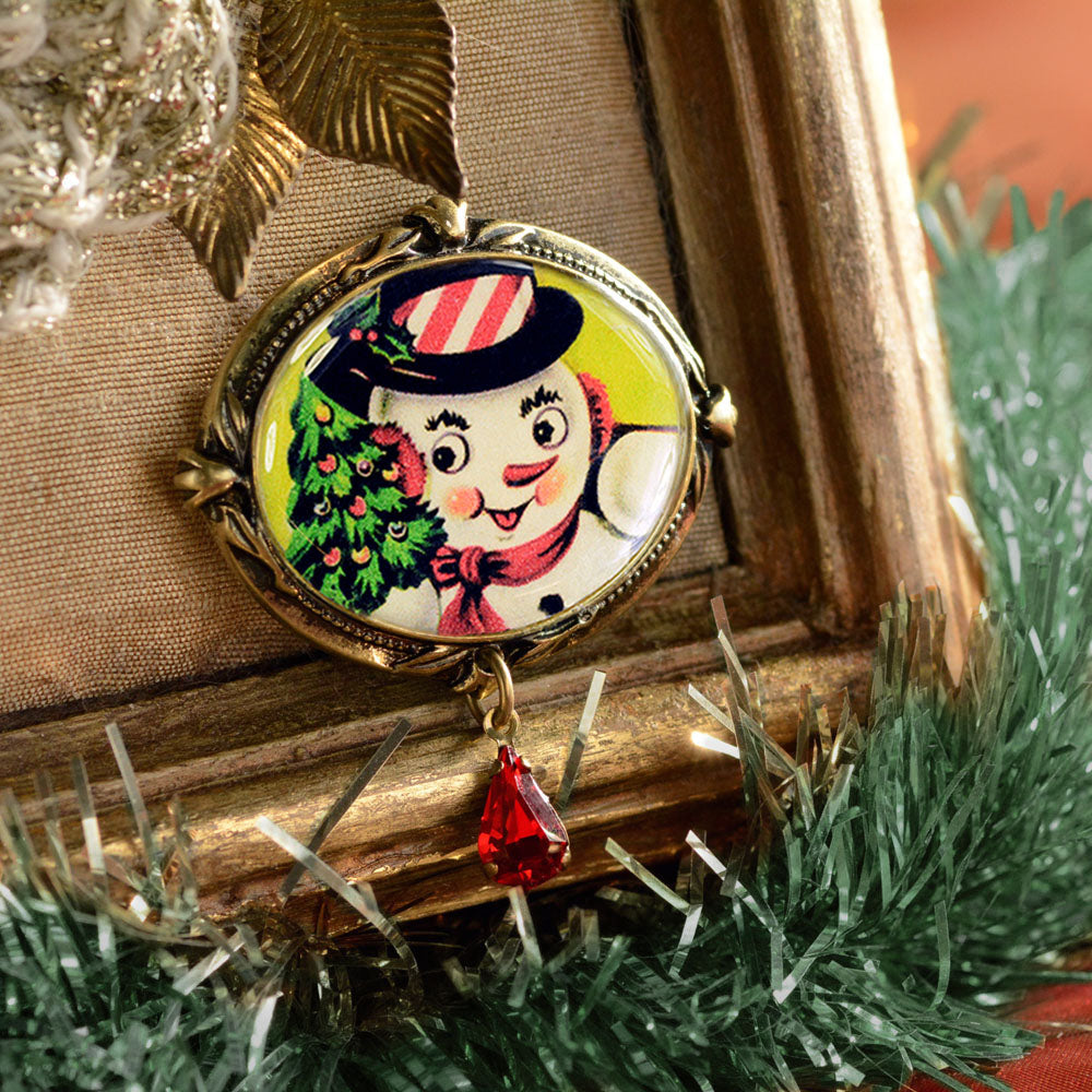 When you need a little Christmas, it's yours this very minute with this nostalgic pin. Sure to touch your heart or someone you care about. This image is adapted from an actual vintage print of the 1960s.Designed and made in our Los Angeles studios, it is mounted on a detailed and dimensional bezel. A garnet red crystal teardrop dangles below. Size: 1.75" L x 1.75" W. Made in our Los Angeles studio. Collect the series and gift some away!